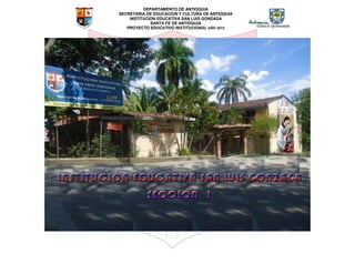 El documento presenta el Proyecto Educativo Institucional de la Institución Educativa San Luis Gonzaga en Santa Fe de Antioquia para el año 2012. El PEI describe la misión y visión de la escuela para formar estudiantes con capacidad crítica que respeten la dignidad humana y sean capaces de apreciar el mundo de manera honesta y constructiva. El documento también incluye la justificación y objetivos del PEI de acuerdo con el contexto socioeconómico y legal colombiano.