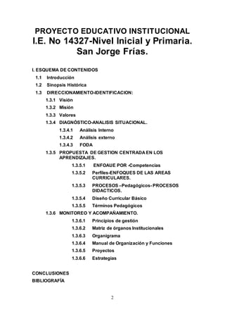 Este documento presenta la historia de la Institución Educativa N° 14327 en San Jorge Frías desde sus inicios. Comenzó en 1959 como una escuela fiscal pequeña que ofrecía educación primaria incompleta. A lo largo de los años, la escuela creció y mejoró, ofreciendo educación primaria completa para 1969 y cambiando su nombre y estructura varias veces. El documento también describe a los primeros maestros y maestras que enseñaron en la escuela y ayudaron a establecerla como una institución educativa importante para