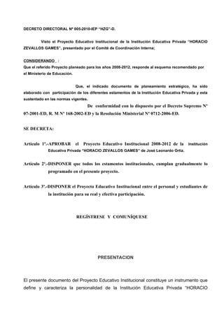 Este documento presenta el Proyecto Educativo Institucional (PEI) de la Institución Educativa Privada "HORACIO ZEVALLOS GAMES" para los años 2008-2012. Incluye la identidad de la institución, su misión, visión y valores. También contiene un diagnóstico de la situación interna y externa, y propone un modelo pedagógico, de gestión y proyectos para mejorar la calidad educativa de acuerdo con las necesidades de los estudiantes y la comunidad.