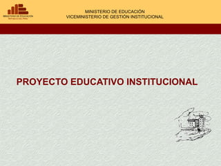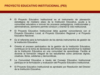 El documento describe el Proyecto Educativo Institucional (PEI) como el instrumento de planificación estratégica de mediano plazo de las instituciones educativas. El PEI orienta la gestión de la institución educativa y debe estar alineado con los proyectos educativos nacional, regional y local. El PEI es formulado de manera participativa por la comunidad educativa y aprobado por resolución del director para transformar la institución en una comunidad de aprendizaje.