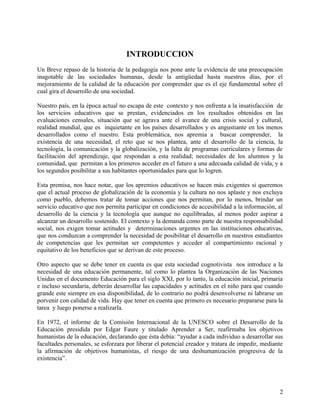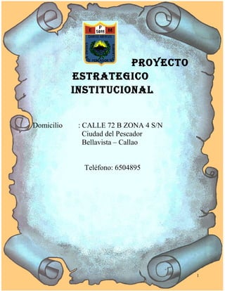 Este documento presenta un proyecto estratégico institucional para mejorar la calidad de la educación brindada. El proyecto propone capacitar a docentes y personal en nuevas corrientes pedagógicas, didácticas y gestión institucional para desarrollar competencias en los estudiantes. También busca optimizar recursos, habilitar nuevos ambientes de aprendizaje, y promover valores para formar ciudadanos competentes. El objetivo general es mejorar el servicio educativo y convertir a los estudiantes en personas útiles para la sociedad.