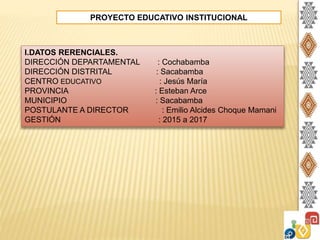 Este documento presenta el proyecto educativo institucional comunitario del Centro Educativo Alternativo "Jesús María" en Sacabamba, Bolivia para los años 2015-2017. El proyecto describe la situación actual del centro, su visión, misión y principios educativos, y establece objetivos y actividades para implementar un modelo educativo sociocomunitario productivo, mejorar la calidad y cobertura de la educación, aumentar la participación comunitaria, y fortalecer la gestión educativa.