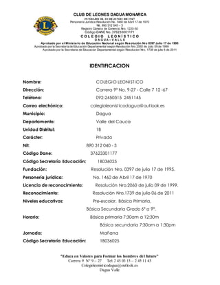 Este documento presenta el proyecto educativo institucional del Colegio Leonístico de Dagua Valle. El colegio fue fundado en 1967 y ha sido aprobado por el Ministerio de Educación Nacional y la Secretaría de Educación Departamental. El proyecto educativo describe la misión, visión, principios y objetivos del colegio, así como su estructura administrativa y académica de acuerdo con la legislación colombiana. El consejo directivo adoptó formalmente este proyecto educativo en 2015 para guiar el desarrollo del colegio.