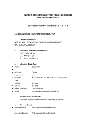 El Instituto de Educación Superior Pedagógico Público 'San Josemaría Escrivá' de Cañete, establece un proyecto educativo institucional que abarca desde 2010 hasta 2015, orientado a la formación integral de futuros profesionales en educación inicial, primaria y secundaria. Con un enfoque en principios éticos y cristianos, busca ofrecer una educación de calidad, incorporando innovaciones y prácticas pedagógicas modernas, así como fortalecer la formación continua de docentes. El instituto cuenta con reconocimiento a nivel distrital y nacional por su compromiso con la mejora de la educación en la región.