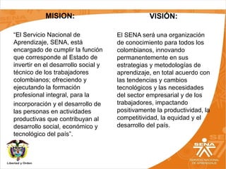 El documento presenta el Proyecto Educativo Institucional del Servicio Nacional de Aprendizaje (SENA) de Colombia. El SENA tiene como misión ofrecer formación profesional integral a los trabajadores colombianos para contribuir al desarrollo social, económico y tecnológico del país. Su visión es ser una organización de conocimiento para todos los colombianos, innovando en estrategias de aprendizaje de acuerdo con las necesidades del sector empresarial y los trabajadores. El documento describe los principios, valores y objetivos de