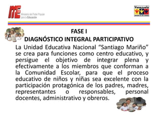 Este documento describe el diagnóstico integral participativo realizado por la Unidad Educativa Nacional "Santiago Mariño" en Upata, Estado Bolívar, Venezuela. La escuela tiene una matrícula de 1,400 estudiantes y personal docente y administrativo calificado. Se realizó una asamblea general para discutir las fortalezas, debilidades, oportunidades y amenazas de la escuela. El diagnóstico ayudará a desarrollar un proyecto integral comunitario para mejorar el proceso educativo.