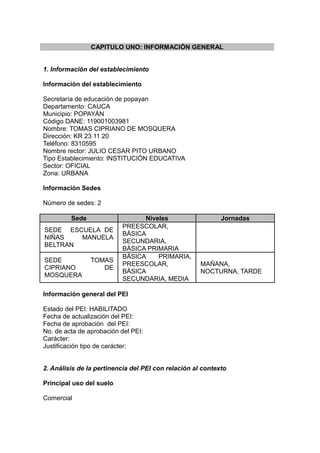 Este documento presenta información general sobre el Proyecto Educativo Institucional de la Institución Educativa Tomas Cipriano de Mosquera en Popayán, Cauca. Describe la misión, visión y principios de la institución, así como su modelo pedagógico, el cual se basa en la escuela tradicional. Además, detalla las estrategias de enseñanza, recursos y métodos de evaluación implementados en las diferentes áreas académicas para los grados décimo y undécimo.