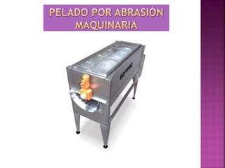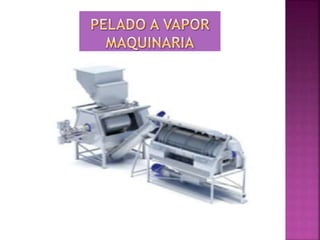 Este documento trata sobre los diferentes métodos y maquinaria utilizados para el pelado de vegetales, frutas y raíces. Explica que el pelado sirve para eliminar las partes no comestibles y mejorar el aspecto y facilitar operaciones posteriores. Luego describe los objetivos del pelado y los principales métodos como el pelado a vapor, a cuchillo, por abrasión, cáustico y a la llama, detallando brevemente sus características y usos. Finalmente incluye ejemplos de diagramas de flujo para procesos de pel
