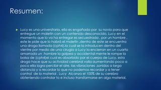 Lucy es una estudiante que es drogada por unos traficantes con una droga experimental llamada CPH4. Al romperse la bolsa que contenía la droga dentro de su cuerpo, Lucy comienza a desarrollar un aumento en su actividad cerebral que le permite percibir sonidos y vibraciones a larga distancia, recordar eventos del pasado, y eventualmente alcanzar el 100% de uso de su cerebro con habilidades sobrehumanas.