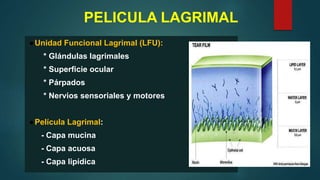 La película lagrimal está compuesta de tres capas: la capa mucina secretada por células caliciformes, la capa acuosa secretada por glándulas lacrimales y la capa lipídica secretada por glándulas de Meibomio. Juntas estas capas forman una barrera protectora sobre la superficie ocular que mantiene un flujo constante y previene la evaporación. La película lagrimal es regulada por vías neuronales y hormonales para mantener la homeostasis de la superficie ocular.