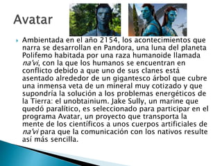 La película Avatar se desarrolla en el año 2154 en la luna Pandora del planeta Polifemo. Los humanos están en conflicto con los na'vi, una raza humanoide nativa, debido a que un clan na'vi vive cerca de un árbol gigante que cubre una veta de un mineral valioso llamado unobtainium. Jake Sully, un marine parapléjico, es seleccionado para participar en el programa Avatar que le permite controlar un cuerpo artificial na'vi y comunicarse con ellos.