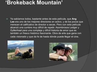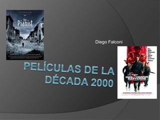 El documento resume 25 películas notables de la década de 2000. Algunas de las películas destacadas incluyen 'Brokeback Mountain', dirigida por Ang Lee, que trata una historia de amor compleja; 'Million Dollar Baby' de Clint Eastwood, un drama sobre vivir, amar y morir; y 'Hijos de los hombres' de Alfonso Cuarón, un relato de ficción científica sobrio sobre la ausencia de esperanza en el mundo.