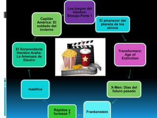 Este documento presenta las principales películas esperadas para el 2014, incluyendo Los juegos del hambre: Sinsajo - Parte 1, El amanecer del planeta de los simios, Transformers: Age of Extinction, X-Men: Días del futuro pasado, Frankenstein, Rápidos y furiosos 7, Maléfica, El Sorprendente Hombre Araña: La Amenaza de Electro, y Capitán América: El soldado del invierno. Se provee una breve sinopsis de la trama de cada película.