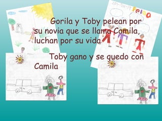 El documento narra una historia de dos personajes, Gorila y Toby, quienes compiten por el amor de una chica llamada Camila. La trama se desarrolla en un contexto de lucha y enfrentamiento entre ambos. Al final, Toby emerge como el ganador y se queda con Camila.