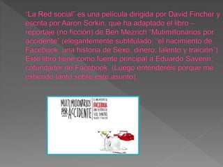 El documento analiza la película La Red Social, resaltando la habilidad del guionista para contar la historia de forma fluida a pesar de los saltos temporales. También señala que a pesar de tratar sobre hechos reales, el guion evita mostrar escenas clave para evitar problemas legales, adoptando en su lugar el punto de vista de Eduardo Saverin. Finalmente, sugiere que al no conocer las verdaderas razones de Zuckerberg, el guion ofrece algunas posibles causas para su comportamiento.