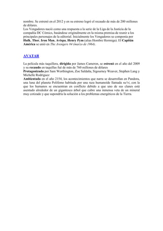 El documento resume brevemente 5 películas populares: Star Wars: Episode IV - A New Hope, Batman: The Dark Knight, Titanic, The Avengers y Avatar. Proporciona detalles como el año de estreno, director, recaudación y actores principales para cada película.