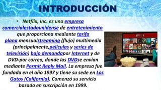 Netflix comenzó en 1997 como un servicio de alquiler de DVD por correo en Estados Unidos. Ahora ofrece transmisión en línea de películas y programas de televisión a través de una suscripción mensual. Netflix opera utilizando un reproductor de Microsoft Silverlight para transmitir contenido sin descargas. Aunque el intercambio de cuentas entre usuarios plantea preguntas legales, Netflix ve esta práctica como una oportunidad de expansión. La compañía ofrece contenido para todas las edades y niños a través de categorías separadas.
