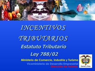 El documento describe varios incentivos y programas del gobierno colombiano para promover el turismo sostenible y las microempresas, incluyendo exenciones de impuestos para servicios de ecoturismo, talleres de desarrollo organizacional, fondos para proyectos productivos, líneas de crédito de FINDETER para el sector turismo, y garantías de préstamos a través del Fondo Nacional de Garantías.