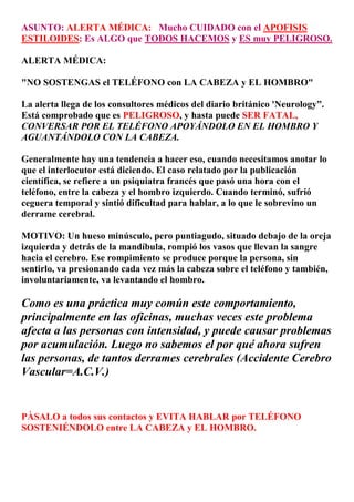 Este documento advierte sobre los peligros de sostener un teléfono entre la cabeza y el hombro mientras se habla, debido a que puede causar presión sobre el apófisis estiloides, un hueso pequeño debajo de la oreja que puede romper los vasos sanguíneos hacia el cerebro y causar un derrame cerebral o ceguera temporal. Relata el caso de un psiquiatra francés que sufrió esto después de una hora de conversación telefónica de esta manera. Recomienda evitar esta práctica común para prevenir