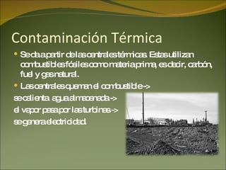 Las centrales térmicas contaminan el aire y contribuyen al efecto invernadero al emitir gases contaminantes a la atmósfera. Esto puede causar problemas respiratorios y de salud en los seres humanos, así como afectar los ecosistemas acuáticos y el paisaje. Las centrales nucleares generan residuos radiactivos peligrosos y aumentan la radiactividad de las personas, lo que puede causar enfermedades. La lluvia radiactiva deposita partículas radiactivas en la superficie terrestre y genera radiación que