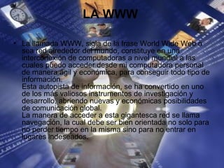 La World Wide Web ofrece muchas ventajas como acceso rápido y económico a información, pero también conlleva riesgos como el acceso fácil a contenido peligroso como drogas y pornografía. Los chats en línea plantean amenazas como contacto con hackers o depredadores, y la publicidad en redes sociales a menudo lleva a sitios no deseados. Es importante que los padres estén conscientes de estos peligros.