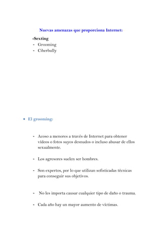 La red mundial plantea peligros como delitos cibernéticos, acoso a menores y difusión de material privado sin consentimiento. Existen unidades policiales que investigan estos delitos. Algunas amenazas específicas son el grooming, ciberacoso y sexting. Las redes sociales pueden usar y compartir la información personal de los usuarios.