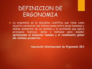 Este documento trata sobre los peligros ergonómicos en el trabajo. Define la ergonomía como la disciplina que busca optimizar la interacción entre humanos y sistemas para mejorar el bienestar y rendimiento. Explica que un peligro ergonómico es una condición relacionada al esfuerzo físico que puede causar daño a la salud, mientras que un riesgo ergonómico es la probabilidad de que un peligro cause una lesión. Finalmente, recomienda medidas como rotación de tareas, pausas