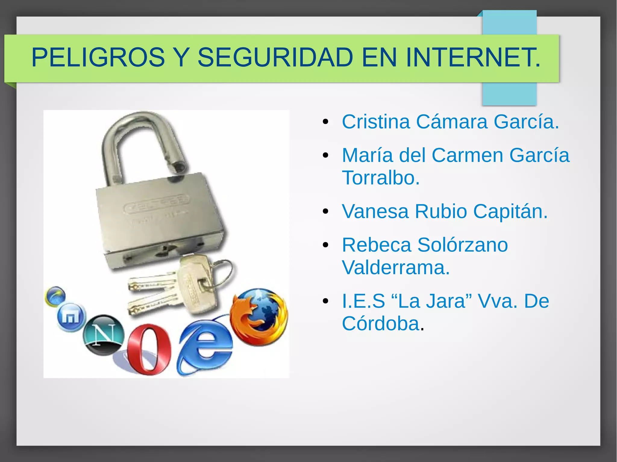 El documento describe varios peligros de Internet como malware, spam, scam, ciberacoso, grooming y robo de información. También discute la falta de fiabilidad de la información en Internet y la importancia de la educación para que los usuarios se sumerjan de forma segura en el mundo digital.