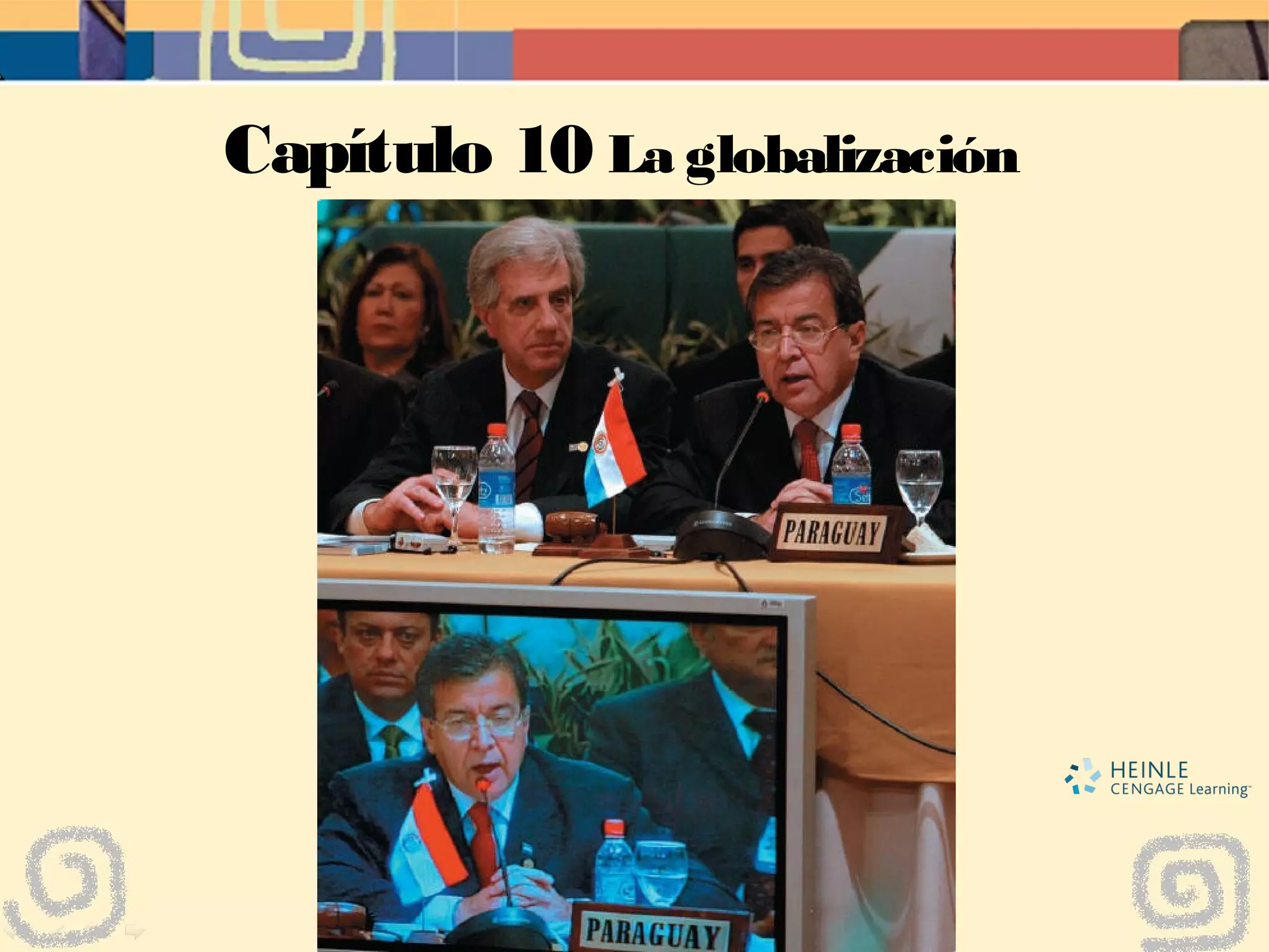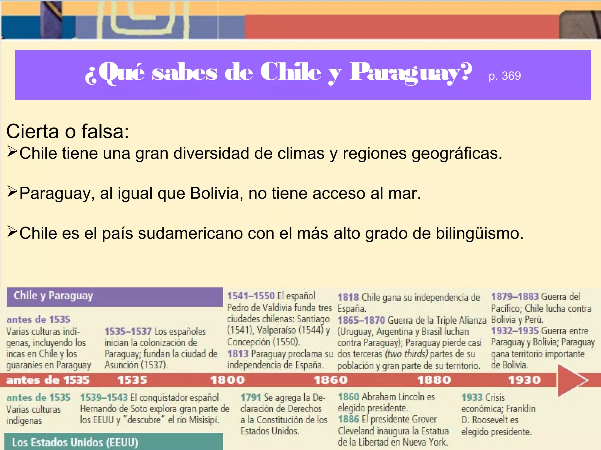Este documento presenta información sobre Chile y Paraguay, incluyendo preguntas de verdadero o falso sobre los países. También cubre temas culturales como el bilingüismo en Paraguay y el reciclaje en Chile. Finalmente, introduce vocabulario relacionado con los desafíos sociales de la globalización y la ecología global.