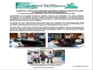Este documento describe el proceso de identificación de recién nacidos a través de la pelmatoscopía. Incluye la toma de huellas plantares del bebé en la sala de partos y su homologación por la policía nacional para la emisión del DNI. Explica que la pelmatoscopía es un derecho fundamental del niño y permite el acceso a servicios de salud, educación y otros.