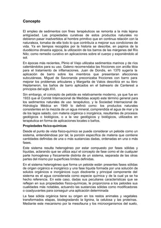 Este documento define peloides y describe sus propiedades físico-químicas. Un peloide es un producto natural compuesto de agua mineral y materia orgánica o inorgánica resultado de procesos geológicos o biológicos. Está formado por fases sólidas como arcilla y materia orgánica, y una fase líquida de agua mineral. Para su uso terapéutico, los peloides deben cumplir con requisitos de calidad como contenido de sales minerales, pH, humedad, y ausencia de contaminantes y micro