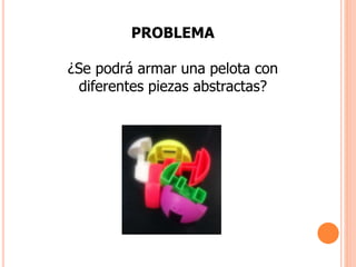 Este documento presenta un proyecto de una pelota multiformas compuesta por piezas abstractas de diferentes colores y formas. El objetivo era armar la pelota en el menor tiempo posible. La hipótesis era que al ensamblar las piezas una por una, la pelota tomaría forma sola. Tras 40 minutos de ensamblar piezas al azar, lograron completar la pelota a pesar de que algunas piezas no coincidían inicialmente. Concluyeron que el ensamblaje requiere habilidad y pasos a seguir a pesar de su grado de