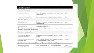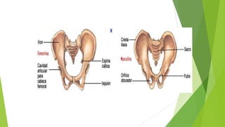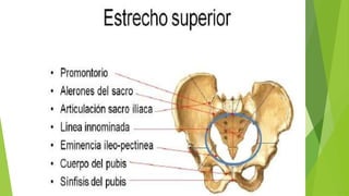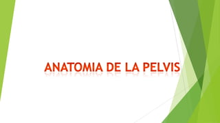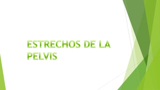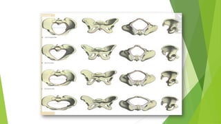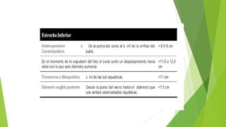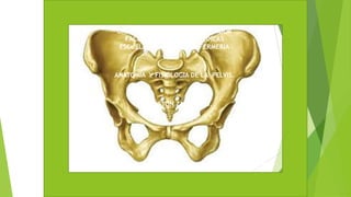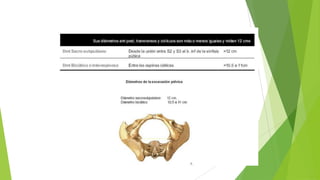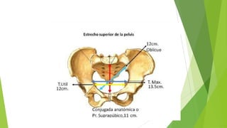 Este documento describe la anatomía y fisiología de la pelvis. La pelvis es la región ósea inferior del tronco que aloja órganos pélvicos y soporta el peso del cuerpo. Contiene diferentes tipos de huesos que forman aperturas por donde pasa el feto durante el parto. El documento explica los diferentes diámetros y tipos de pelvis, así como técnicas para medir la pelvis como la pelvimetría, la cual es importante para evaluar la viabilidad del parto vaginal.