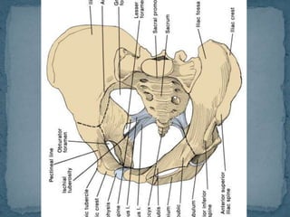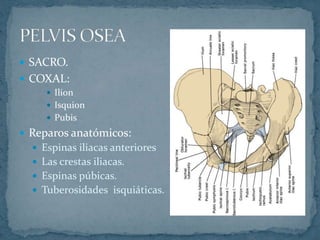 El documento describe la anatomía de la pelvis y sus estructuras óseas como el ilion, isquion y pubis. También describe los órganos contenidos en la pelvis menor como la vejiga urinaria, próstata, testículos y otros. Explica brevemente la irrigación sanguínea y relaciones anatómicas de estos órganos.