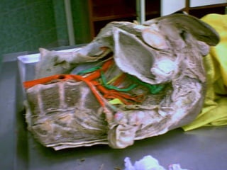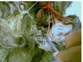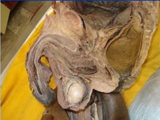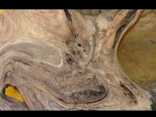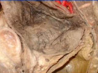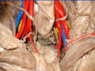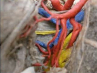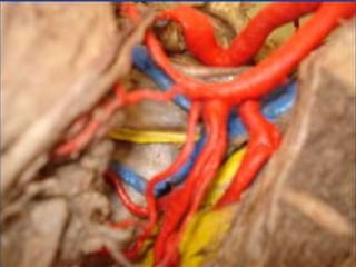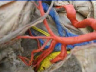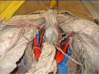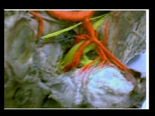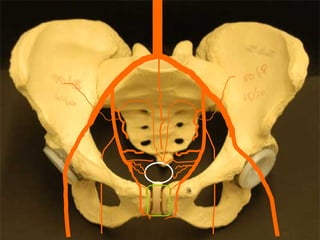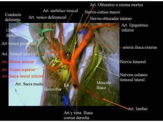 El documento describe las diferentes ramas de la arteria ilíaca interna, incluyendo la arteria umbilical vesical, la rama deferencial, la arteria vesicodeferencial, la arteria rectal media, la arteria pudenda interna y la arteria rectal inferior. Estas ramas irrigan estructuras del suelo pélvico como la vejiga, los conductos deferentes, la próstata y el recto.