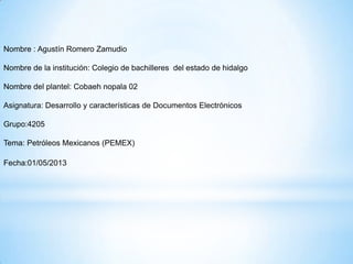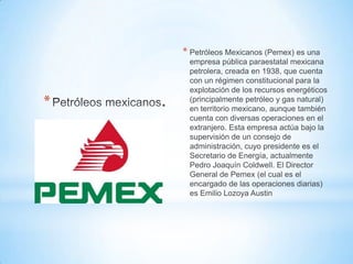 Petróleos Mexicanos (Pemex) es una empresa pública mexicana creada en 1938 para la explotación de recursos energéticos, supervisada por un consejo de administración. A lo largo de su historia, ha enfrentado diversos accidentes y escándalos, así como el establecimiento de un sistema de donativos para apoyar a comunidades y asociaciones. La producción de Pemex se concentra principalmente en estados como Campeche y Tabasco, y su presencia ha traído tanto beneficios como problemas sociales en las regiones donde opera.
