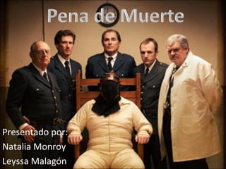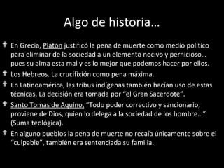 Este documento presenta una historia de la pena de muerte desde la antigüedad hasta la actualidad, incluyendo formas de ejecución como la horca, la decapitación, la silla eléctrica y la inyección letal. También discute la abolición de la pena de muerte en Colombia en 1910 y cómo la Constitución Política de Colombia ahora protege el derecho inviolable a la vida.