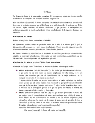 El documento trata sobre el aborto y los delitos relacionados desde una perspectiva legal en Venezuela. Explica las clasificaciones del aborto, los tipos según el Código Penal venezolano, los requisitos para que exista el delito de aborto y las atenuantes y agravantes. También cubre temas como el abandono de personas, la omisión de aviso y socorro, y la difamación.