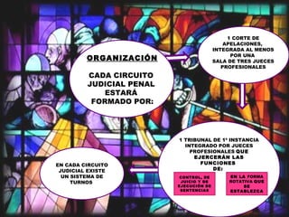 El documento describe la organización del circuito judicial penal, incluyendo que cada circuito estará formado por una Corte de Apelaciones integrada por al menos una sala de tres jueces profesionales y un Tribunal de Primera Instancia integrado por jueces profesionales que ejercerán funciones de control, juicio y ejecución de sentencias de forma rotativa.