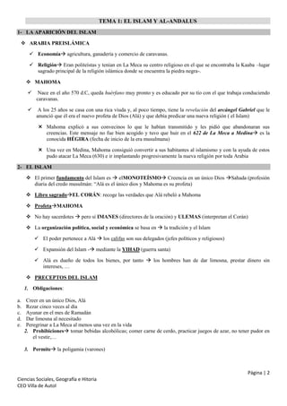 Este documento presenta información sobre el Islam y Al-Andalus. En 3 oraciones: Resume que introduce el Islam en Arabia preislámica, con Mahoma recibiendo la revelación del Corán y propagando la nueva religión. Explica que tras la muerte de Mahoma, el Islam se expandió bajo el Califato Omeya y luego Abasí, incluyendo la conquista musulmana de la Península Ibérica en el 711 d.C. y el establecimiento de Al-Andalus, dividido en etapas como el Emirato, Califato de