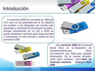 Introducción La memoria USBfue inventada en 1995 por IBM, pero no fue patentada por él. Su objetivo era sustituir a los disquetes con mucha más capacidad y velocidad de transmisión de datos. Aunque actualmente en un CD o DVD se puede almacenar memoria para luego borrarla y manipularla, lo más cómodo y usado son las memorias USB. Una memoria USB (de Universal Serial Bus) es un dispositivo de almacenamiento que utiliza una memoria tipo flash para guardar información. Se le conoce también, entre otros nombres, como lápiz de memoria, memoria externa o lápiz USB