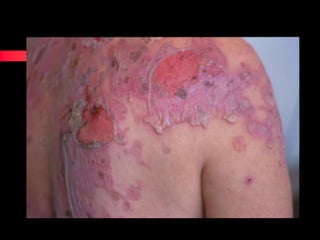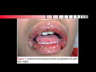 El documento describe diferentes tipos de pénfigo, enfermedades ampollosas autoinmunes causadas por autoanticuerpos contra proteínas de los desmosomas. El pénfigo vulgar se debe a anticuerpos contra la desmogleina 3 y causa ampollas en la epidermis superior. El pénfigo superficial involucra la desmogleina 1 y causa ampollas más superficiales. El pénfigo puede ser inducido por medicamentos o asociado a cáncer. El diagnóstico diferencial depende del tipo de pénfigo.