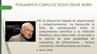 Edgar Morín define el pensamiento complejo como la capacidad de ver las conexiones entre ideas y disciplinas en lugar de mantenerlas separadas. Los principios del pensamiento complejo incluyen el diálogo, la recursividad organizacional y lo hologramático. El objetivo es promover un pensamiento no parcelado que reconozca los límites del conocimiento simplificado.