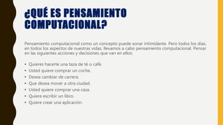 El documento explica los principios fundamentales del pensamiento computacional, que incluyen la descomposición de problemas complejos en partes más pequeñas, el reconocimiento de patrones entre las partes, la abstracción para centrarse en detalles relevantes e ignorar detalles irrelevantes, y la escritura de algoritmos como instrucciones paso a paso para resolver cada parte.