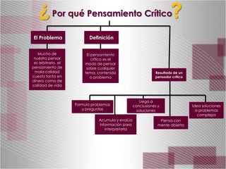 El documento presenta una introducción al pensamiento crítico, definiéndolo como un modo de pensar sobre cualquier tema de manera que se formulan problemas y preguntas, se evalúa la información de manera abierta y se llega a conclusiones y soluciones a problemas complejos. Además, describe los estándares intelectuales universales para evaluar el razonamiento y las características intelectuales esenciales como la humildad, entereza, autonomía y perseverancia.