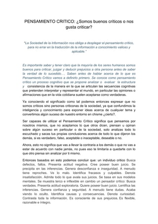Este ensayo discute la diferencia entre ser un crítico y un pensador crítico. Explica que muchas personas son buenas para criticar pero no analizan profundamente la información. Define el pensamiento crítico como un proceso cognitivo que evalúa de manera crítica las creencias y opiniones aceptadas. Finalmente, contrasta las características de un individuo crítico con las de un pensador crítico, concluyendo que ser tolerante y flexible es importante para marcar la diferencia en la sociedad como pensador crítico en lugar de como crí