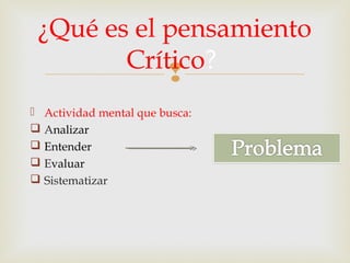 Este documento describe el pensamiento crítico y cómo desarrollarlo. Define el pensamiento crítico como un proceso mental que busca analizar, entender y evaluar un tema de manera sistemática. Explica que el desarrollo del pensamiento crítico implica partir del conocimiento actual del individuo, examinar cómo otros han abordado el tema, y escoger el método adecuado para llegar a una comprensión objetiva del tema.