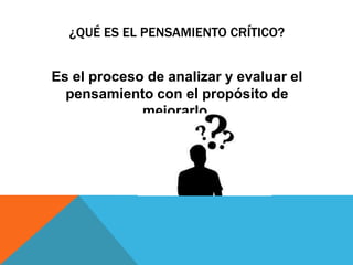 Este documento describe el pensamiento crítico como el proceso de analizar y evaluar el pensamiento con el objetivo de mejorarlo. Explica que desarrollar habilidades de pensamiento crítico nos permite resolver problemas de manera eficiente, incluso problemas desconocidos. Finalmente, proporciona estrategias para despertar el pensamiento crítico en los estudiantes, como motivarlos a pensar de manera más profunda y cuestionadora sobre los materiales de estudio.