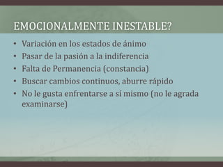 El documento habla sobre la inestabilidad emocional, sus manifestaciones como variaciones en el estado de ánimo y falta de constancia, y sus causas como experiencias dolorosas en la niñez. Para ser estable, se debe guiar por la paz en lugar de las emociones y confiar en que Dios establecerá a aquellos que sufren después de un breve sufrimiento.