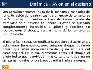 Un grupo de consultores sobrevivió a un accidente aéreo en el desierto de Sonora, y deben priorizar la importancia de los objetos rescatados para asegurar su supervivencia. La lista incluye un espejo cosmético como el más crítico para señalizar su ubicación y otros elementos esenciales para enfrentar la deshidratación y la comunicación. Además, el documento explora la importancia del pensamiento lateral en el diseño de procesos empresariales, destacando cómo romper paradigmas puede generar innovación y éxito.